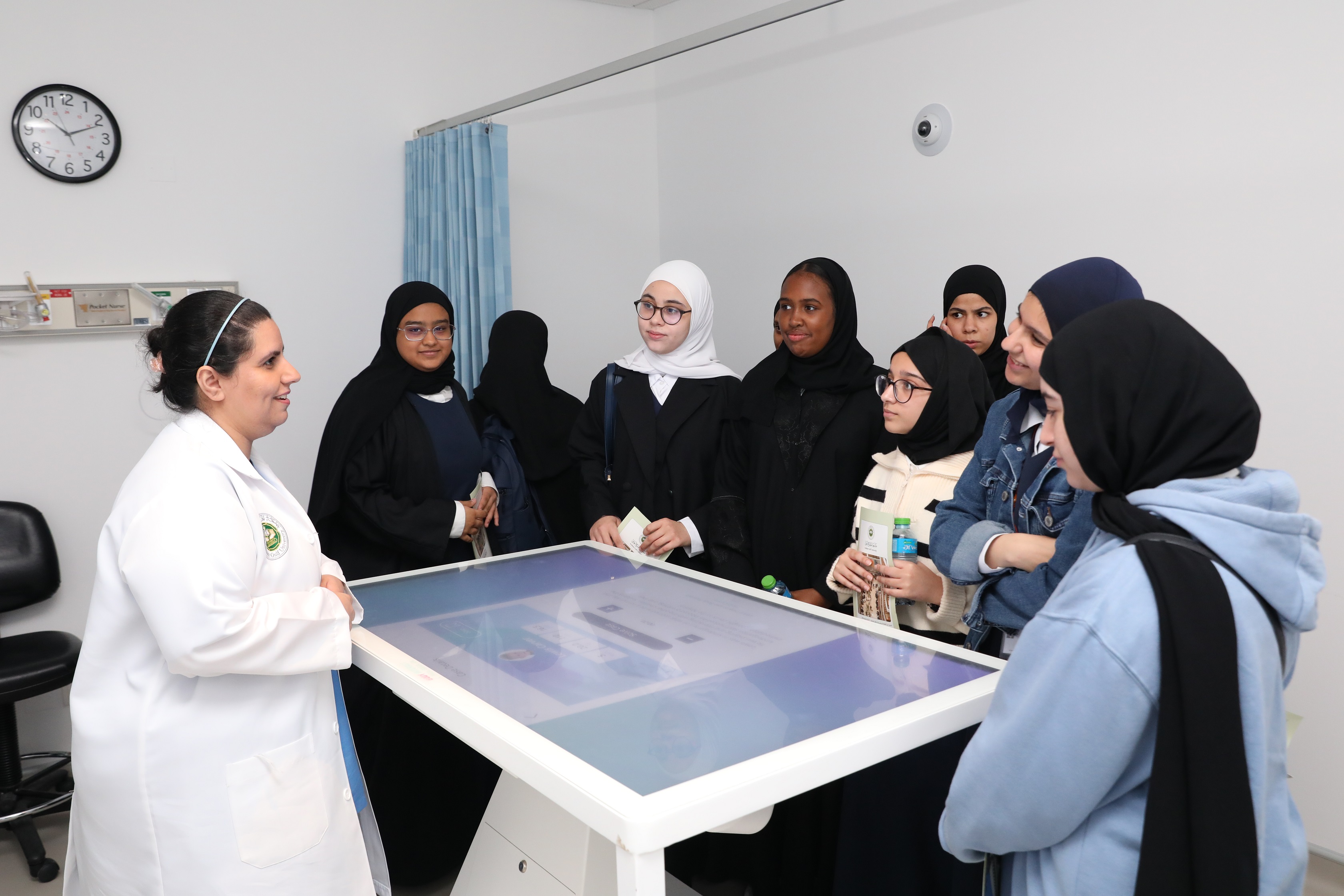 واطلعن على متحف التشريح التابع لكلية الطب والعلوم الصحية الذي يحتوي على جثث ادمية حقيقية وبلاستكية وهياكل عظمية ومجسمات تفصيلية تشرح أجزاء جسم الإنسان، تساعد طلبة الطب على التعرف على الأمراض المختلفة وتشخيصها بشكل دقيق، وتعرفن في السياق ذاته على نظام التعليم في الكلية القائم على منهج حل المعضلات، والمناهج الدراسية التي تهدف إلى تزويد طلبة الدراسات الطبية بالمعرفة اللازمة، وتهيئة المواقف المناسبة والمهارات المهنية الضرورية لممارسة فعالة وناجحة في المجتمع الطبي تساعدهم على انتهاج طريق التعلم و التطور المستمر في الطب، كما اطلعن على طبيعة العمل في وحدة القبول والتسجيل وهي من الوحدات الرئيسية في الجامعة، نظرا لصلتها المباشرة مع الطلبة وجهات ابتعاثهم منذ لحظة قبولهم وتسجيلهم حتى تخرجهم من الجامعة، واستمعوا لشروط القبول والتسجيل والبرامج الأكاديمية التي تطرح كليات الجامعة، كما زرن مكتبة الجامعة وتعرفن على تخصصات الكتب الطبية والتربوية والتقنية التي تحتويها، إذ توفر المكتبة مصادر المعلومات لجميع البرامج العلمية التي تُدرس في الجامعة.
