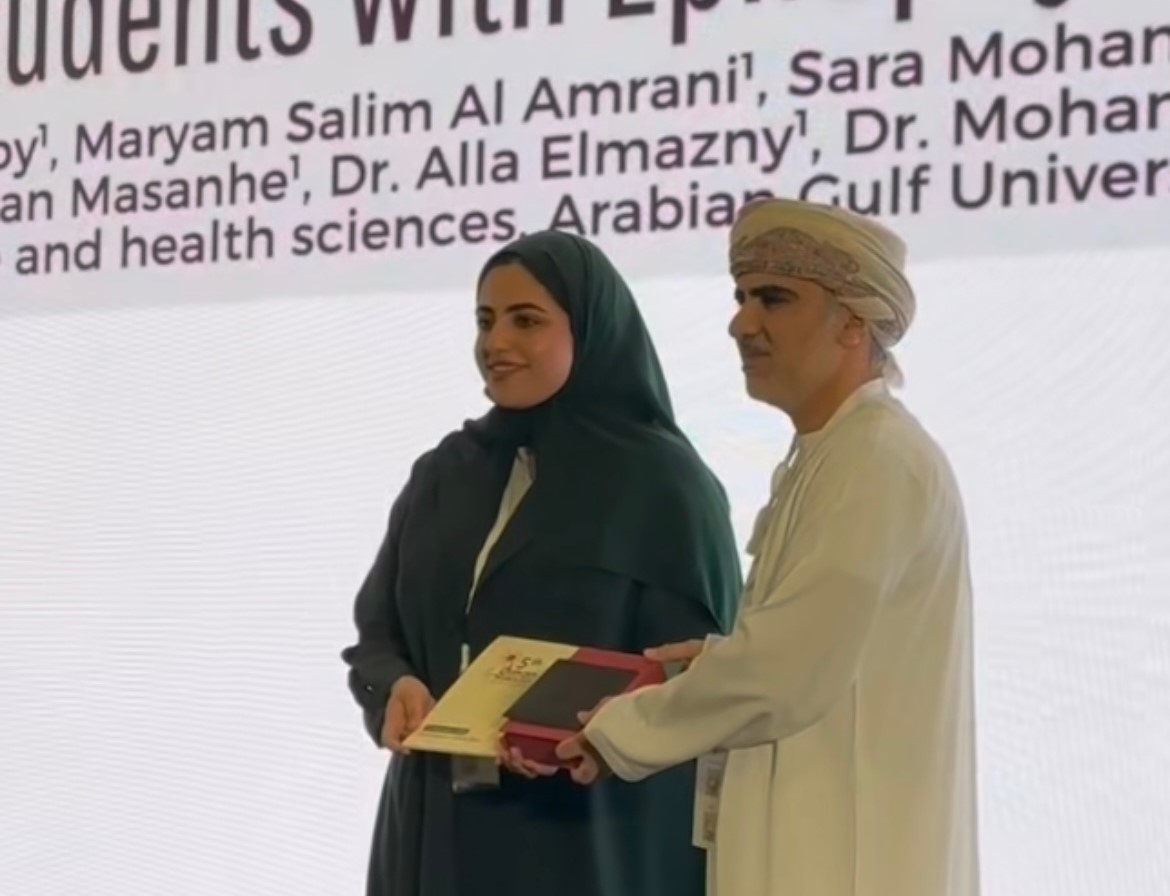 A student research team from the College of Medicine and Health Sciences at Arabian Gulf University (AGU) showcased their work at the 5th Oman Neurology Conference, held recently in Muscat. Their research, titled "Schoolteachers Knowledge and Attitudes Toward Students with Epilepsy in the Sultanate of Oman" earned them fourth place among the top five scientific posters out of 24 presented entries.