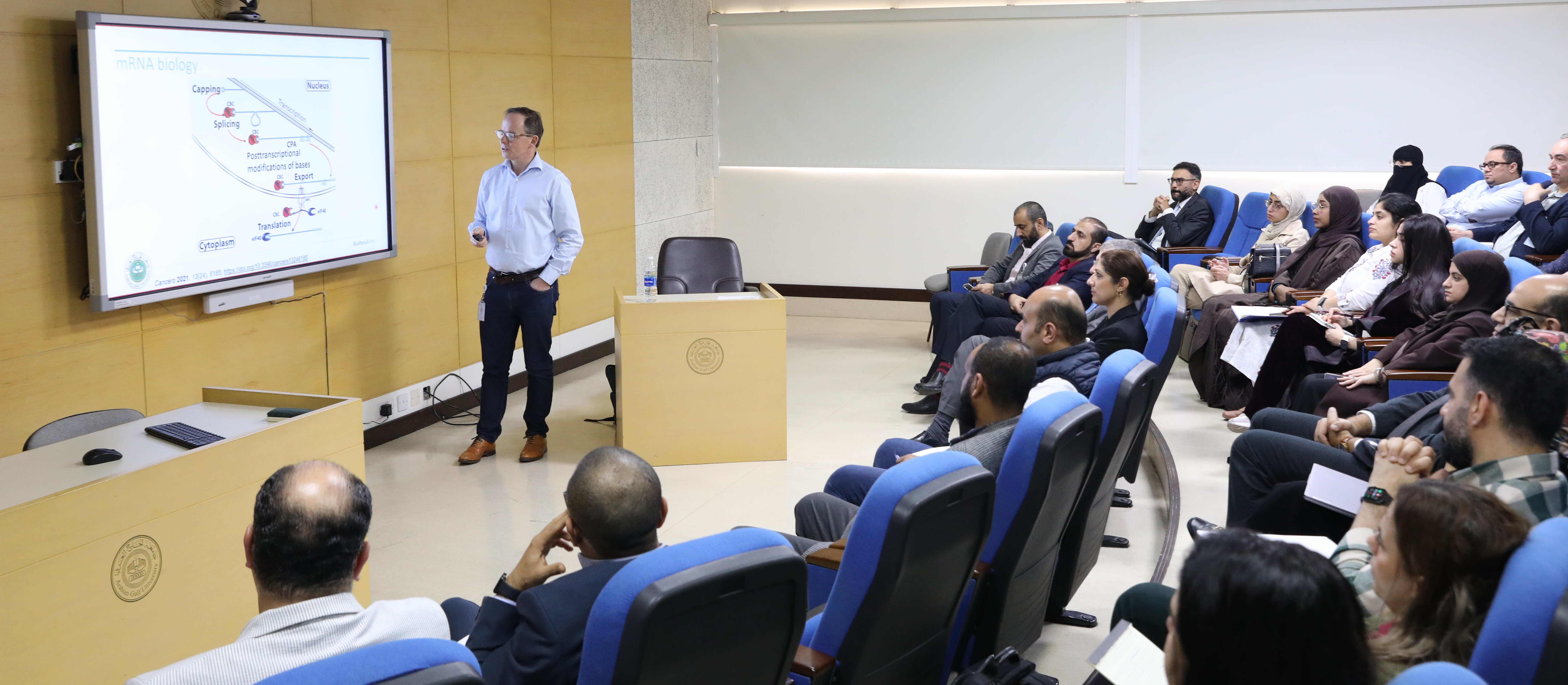 During the lecture and workshop, attended by a number of PhD and Master’s students and several faculty members at the College of Medicine and Health Sciences, Prof. Brock touched on the latest developments in the field of RNA technology therapy, which is considered one of the modern innovative methods for treating many genetic, cancerous, inflammatory and other diseases.