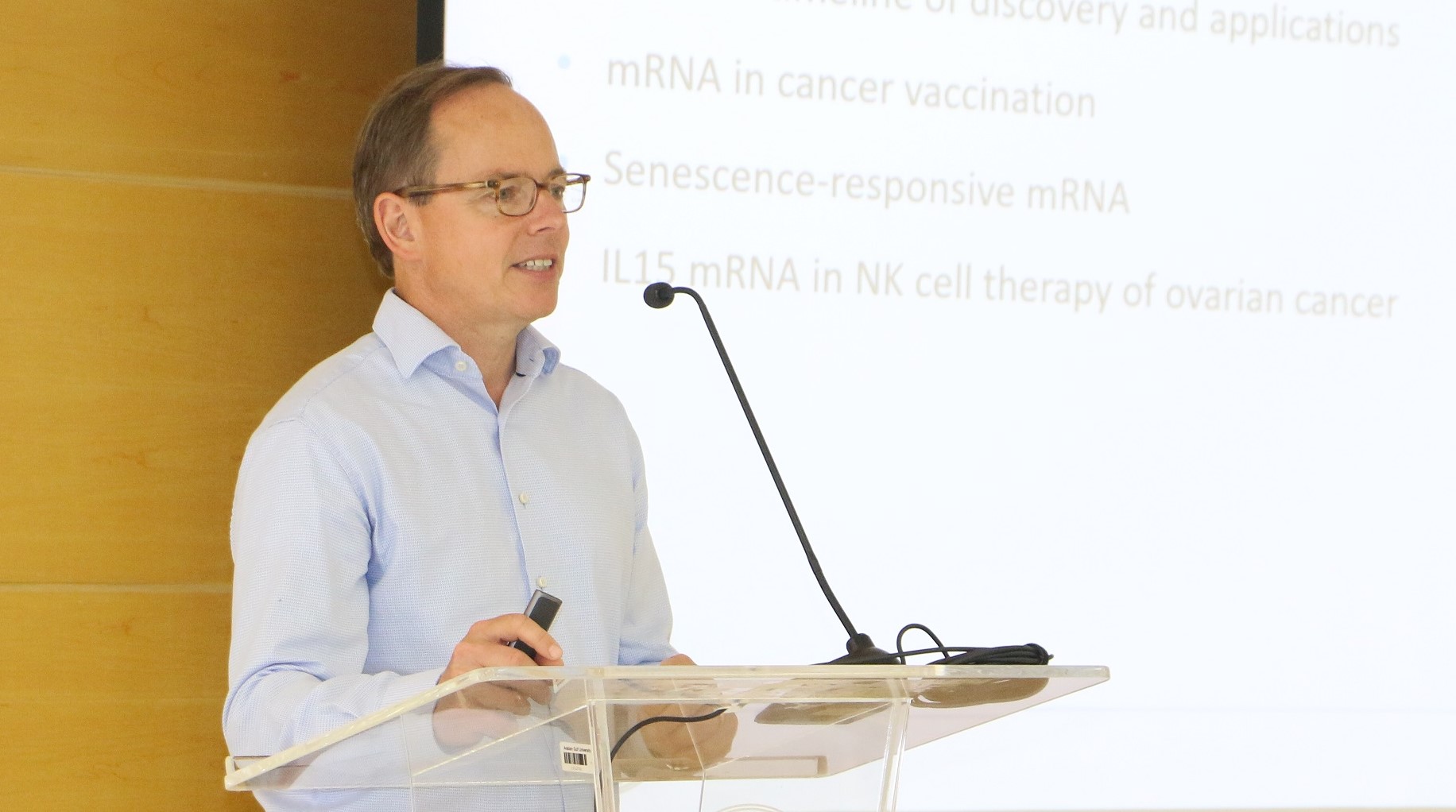 The forum featured a series of presentations by both local and international experts, focusing on innovative applications of biotechnology in medicine and public health. These began with a lecture by Professor Roland Brock, Professor of Biochemistry at Radboud University, Netherlands, and Adjunct Professor at AGU. He discussed applications of mRNA in immunity and cancer treatment, exploring its potential in designing novel vaccines and targeted therapies.