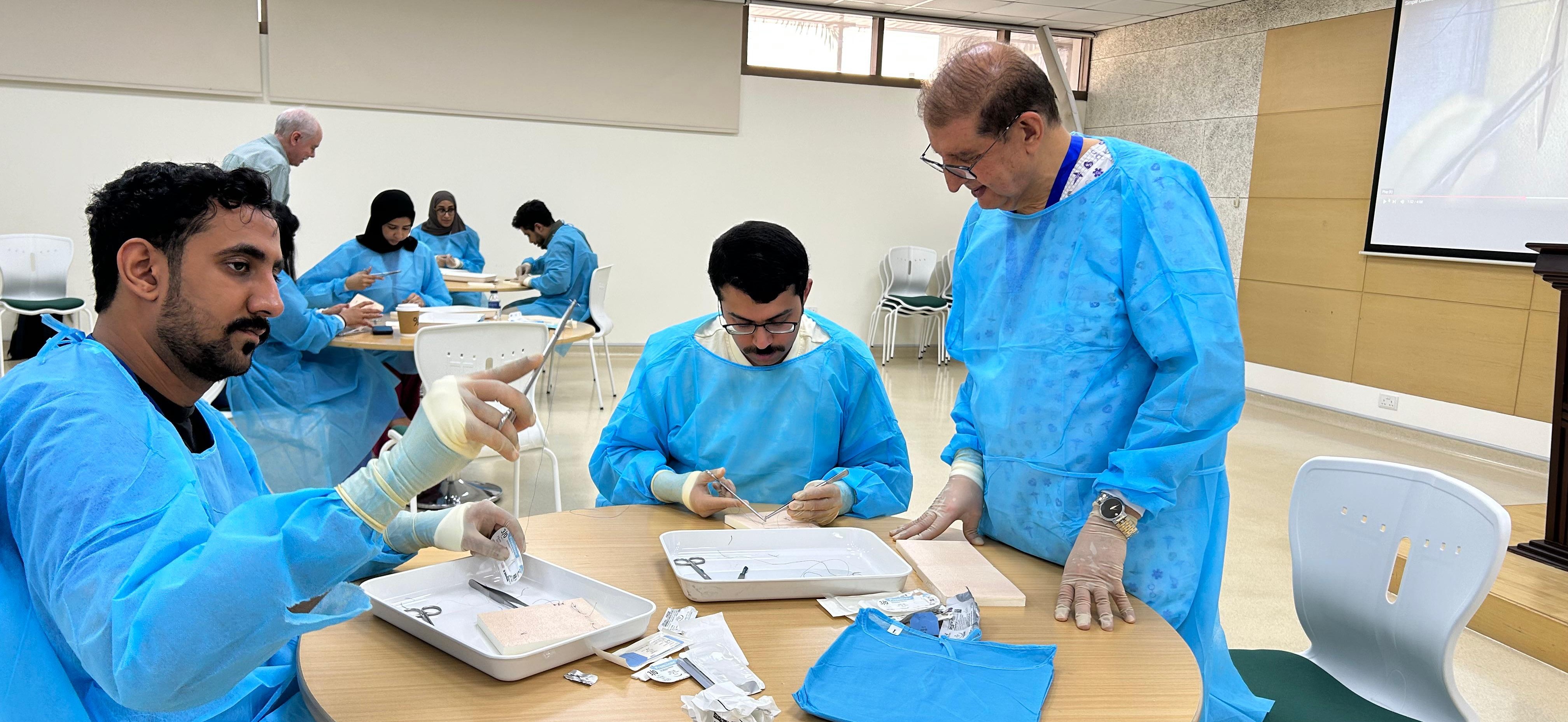 The second workshop, presented by Dr Fatema Habbash, Assistant Professor of Family and Community Medicine and Lifestyle Medicine Specialist, addressed modern lifestyle interventions for weight management, emphasising patient empowerment, behavioural changes, and outcome improvement. Topics included dietary habits, physical activity, sleep, motivation, and goal setting. Additionally, a workshop on basic surgical skills, including endoscopy techniques, was conducted by Dr Hamdi Alshenawi Assistant Professor at the College of Medicine and Health Sciences, supported by other surgical experts from AGU and Salmaniya Hospital.