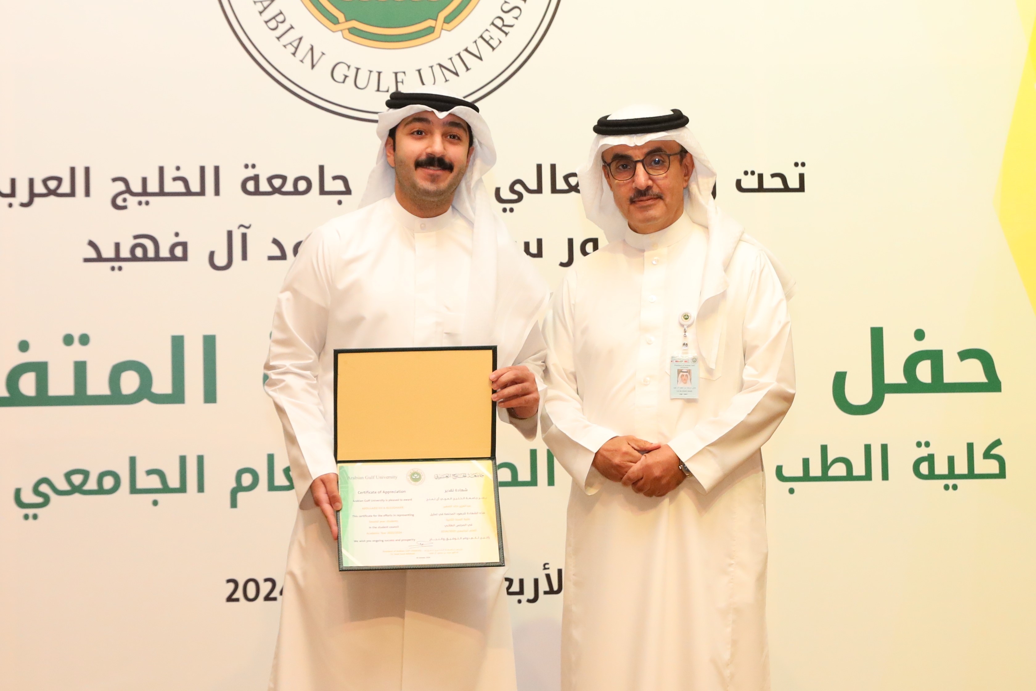 وشدد الدكتور آل فهيد على مواصلة جامعة الخليج العربي الدعم والتشجيع لهؤلاء الطلبة الطموحين ليستمروا في مساراتهم المهنية والأكاديمية بنجاح. منوهاً بأن جامعة الخليج العربي أطلقت العديد من المبادرات التي تدعم الموهبة والتميز والابتكار، وخصصت برنامجًا خاصًا لتطوير قدرات الطلبة الموهوبين في كلية الطب.
