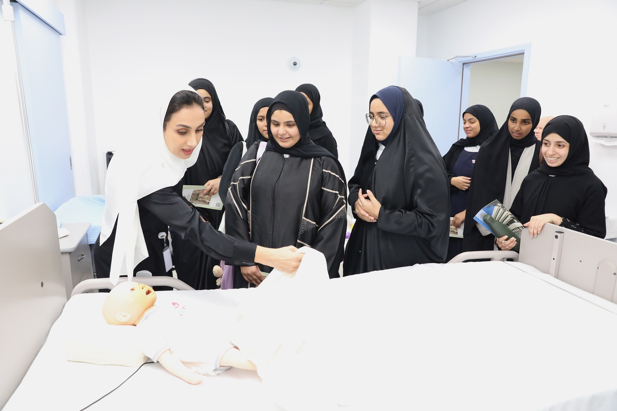 واطلعن على متحف التشريح التابع لكلية الطب والعلوم الصحية الذي يحتوي على جثث ادمية حقيقية وبلاستكية وهياكل عظمية ومجسمات تفصيلية تشرح أجزاء جسم الإنسان، تساعد طلبة الطب على التعرف على الأمراض المختلفة وتشخيصها بشكل دقيق، وتعرفن في السياق ذاته على نظام التعليم في الكلية القائم على منهج حل المعضلات، والمناهج الدراسية التي تهدف إلى تزويد طلبة الدراسات الطبية بالمعرفة اللازمة، وتهيئة المواقف المناسبة والمهارات المهنية الضرورية لممارسة فعالة وناجحة في المجتمع الطبي تساعدهم على انتهاج طريق التعلم و التطور المستمر في الطب، كما اطلعن على طبيعة العمل في وحدة القبول والتسجيل وهي من الوحدات الرئيسية في الجامعة، نظرا لصلتها المباشرة مع الطلبة وجهات ابتعاثهم منذ لحظة قبولهم وتسجيلهم حتى تخرجهم من الجامعة، واستمعوا لشروط القبول والتسجيل والبرامج الأكاديمية التي تطرح كليات الجامعة، كما زرن مكتبة الجامعة وتعرفن على تخصصات الكتب الطبية والتربوية والتقنية التي تحتويها، إذ توفر المكتبة مصادر المعلومات لجميع البرامج العلمية التي تُدرس في الجامعة.