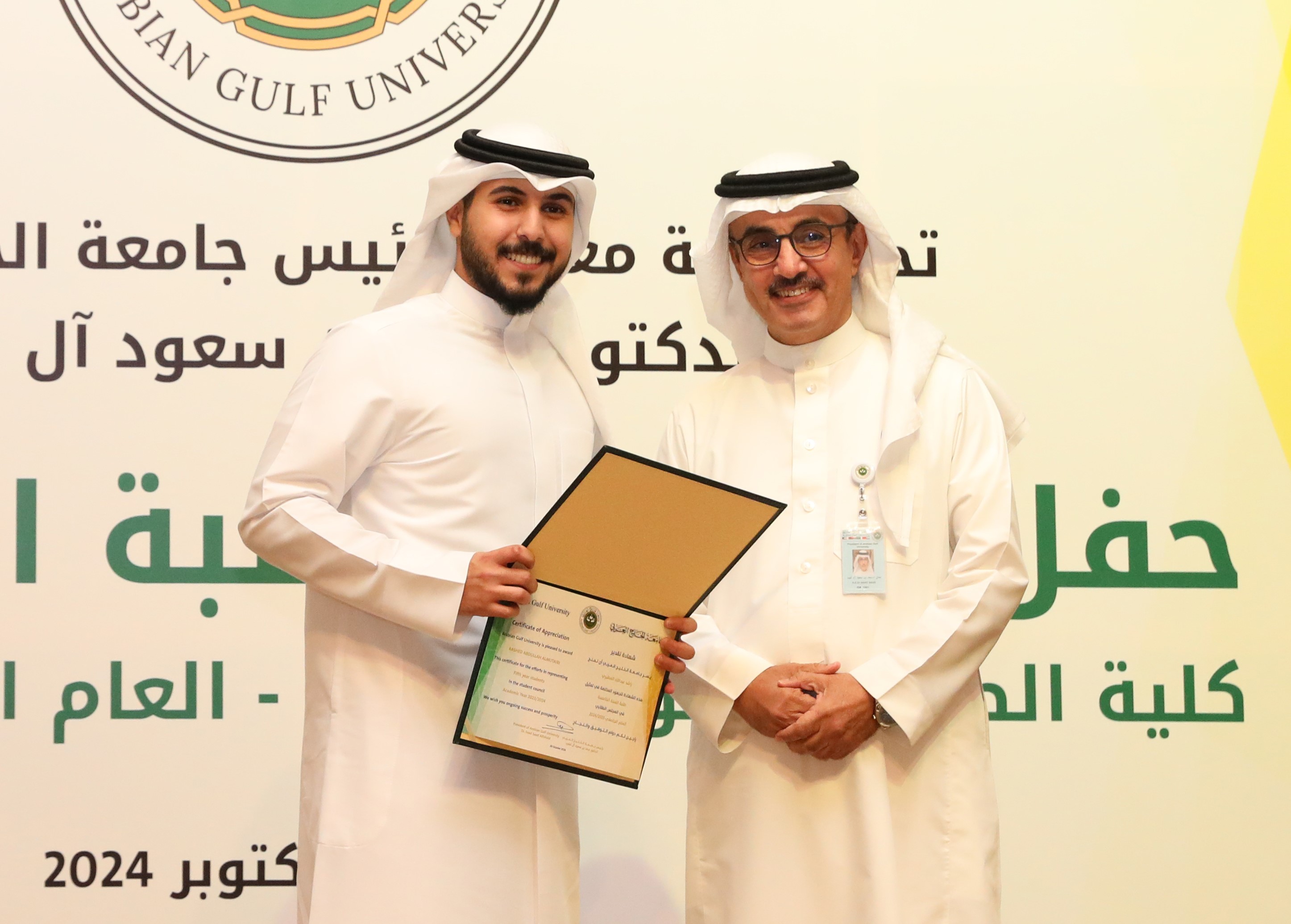 During his speech, the President of AGU, His Excellency Dr Saad bin Saud Al Fuhaid, expressed joy at honouring the students who were models of diligence and academic excellence. In the same context, he extended his gratitude to leaders of the Gulf States for their continuous support and keenness to provide the elements of success for AGU, in the belief of education’s role in arming generations to participate in the development process.