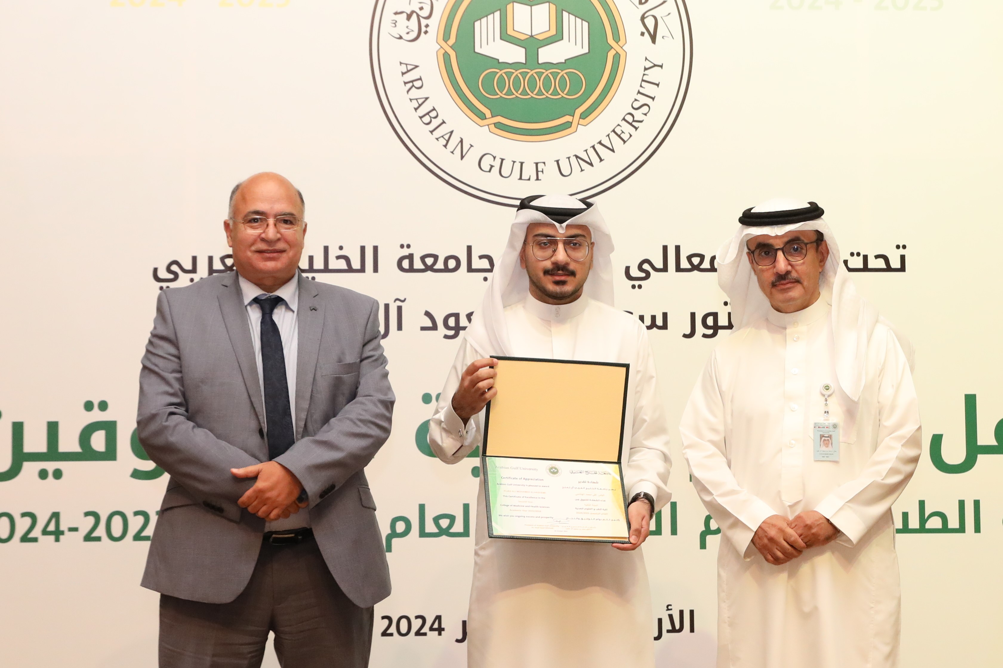 The Deanship of Student Affairs at Arabian Gulf University (AGU) organised a ceremony to honour outstanding students from the College of Medicine and Health Sciences for the academic year 2023/2024, in recognition of